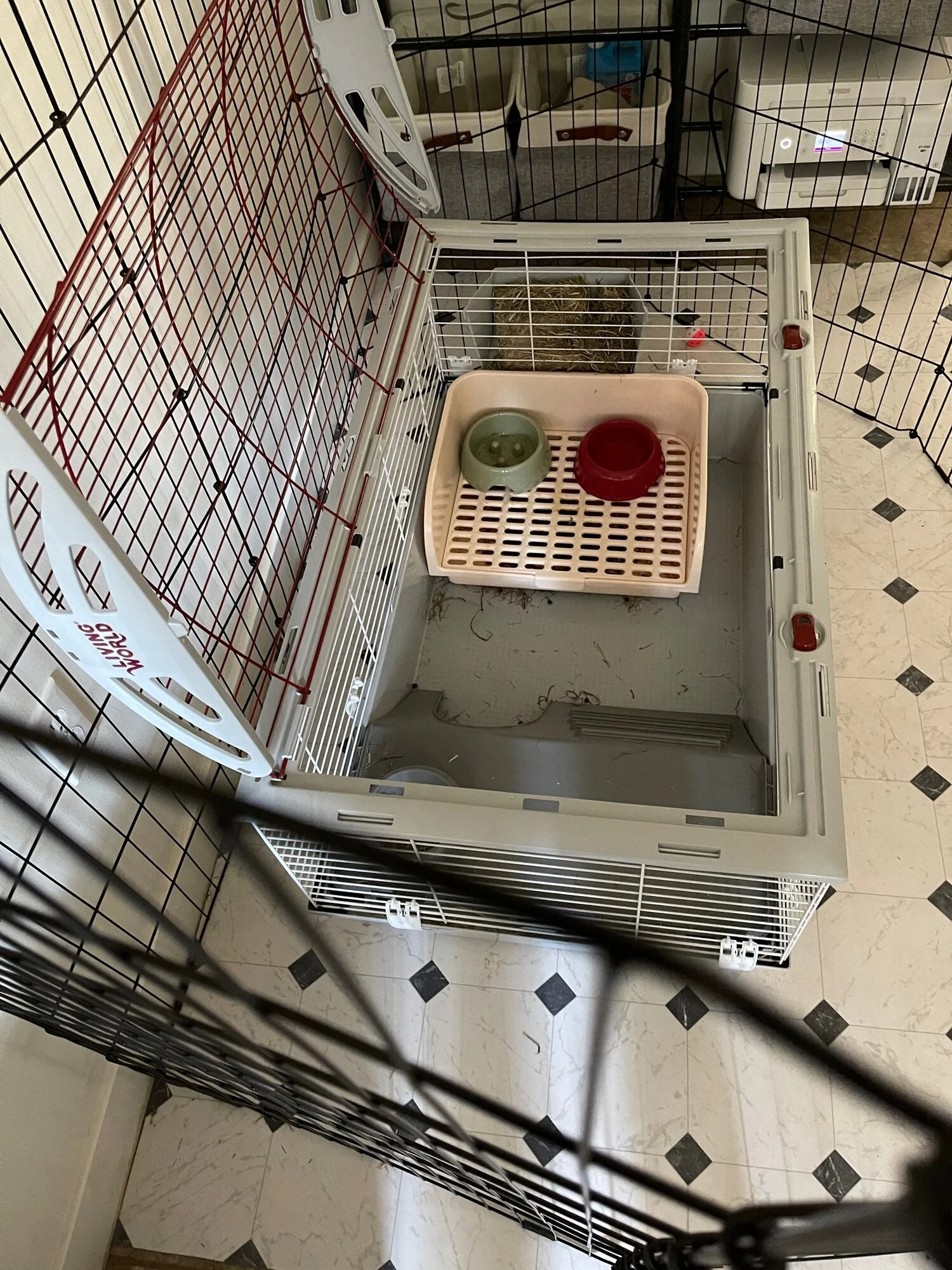 Here is a great setup using the living world cage! Notice the cage is inside the xpen which gives the bunny added space to run and play! The litter box fits perfectly in the large to xlarge living world cage. This is the same litter box the baby you adopt will begin using prior to going home. Water, hay and food needs to be above the litter box as this will help with potty training.