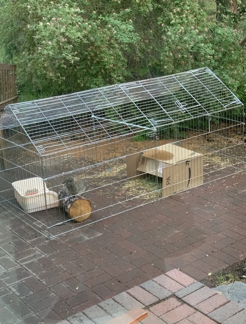Please note, this is an example of an outdoor bun run, this is NOT a suitable home for a bun unless you have a hutch attached to it. We have these cages located throughout our property and put our bunnies in them often to allow them space to run and play.