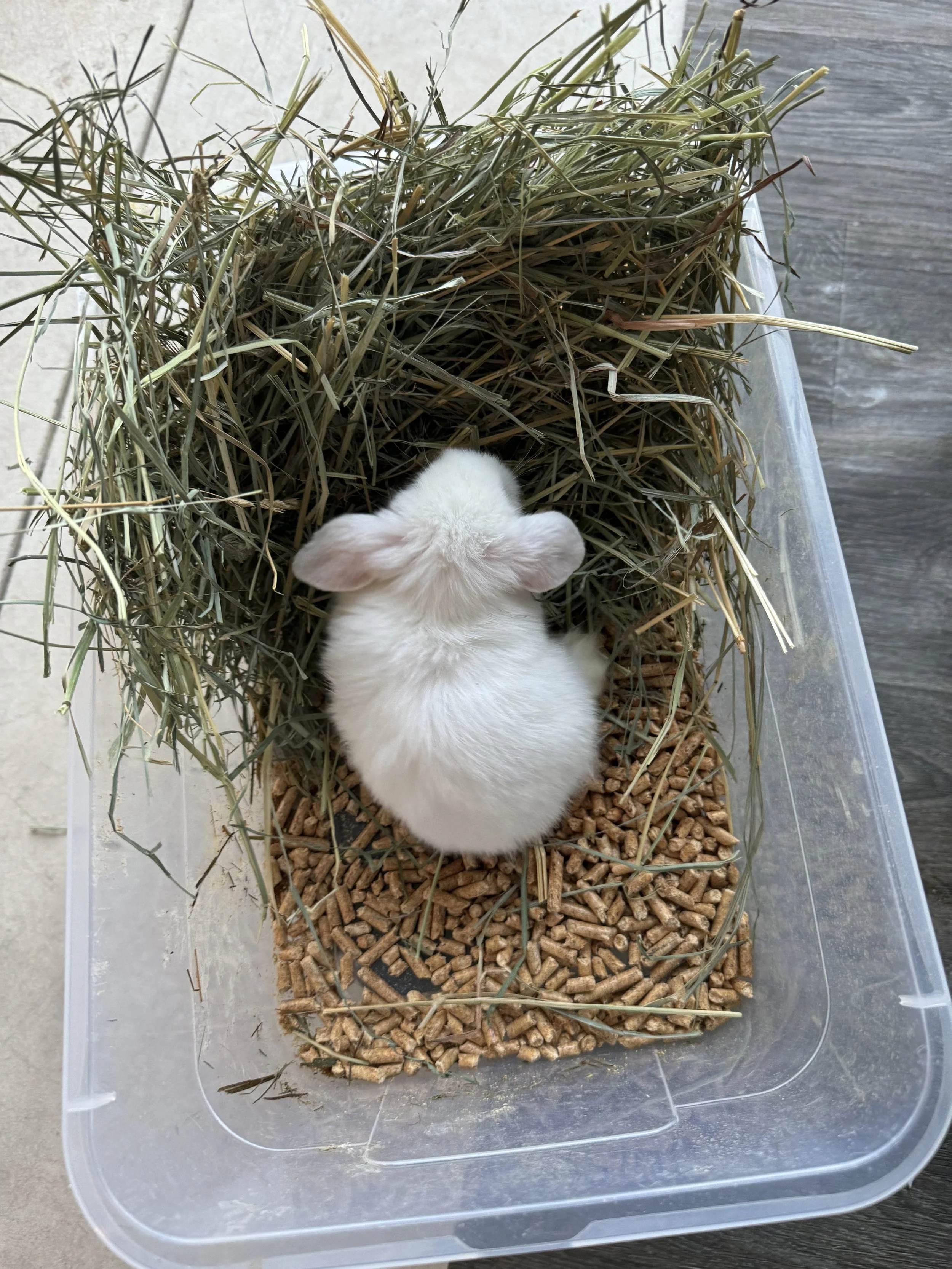 Second, I love how well the bunny can stand in the litter box and eat their pile of hay I place in the corner. Adult and babies alike are able to use this set up. I use a 16 quart clear storage box without lid. I put a thin layer of pine pellets on the bottom and a big old pile of hay in the corner. Litter box link below.
