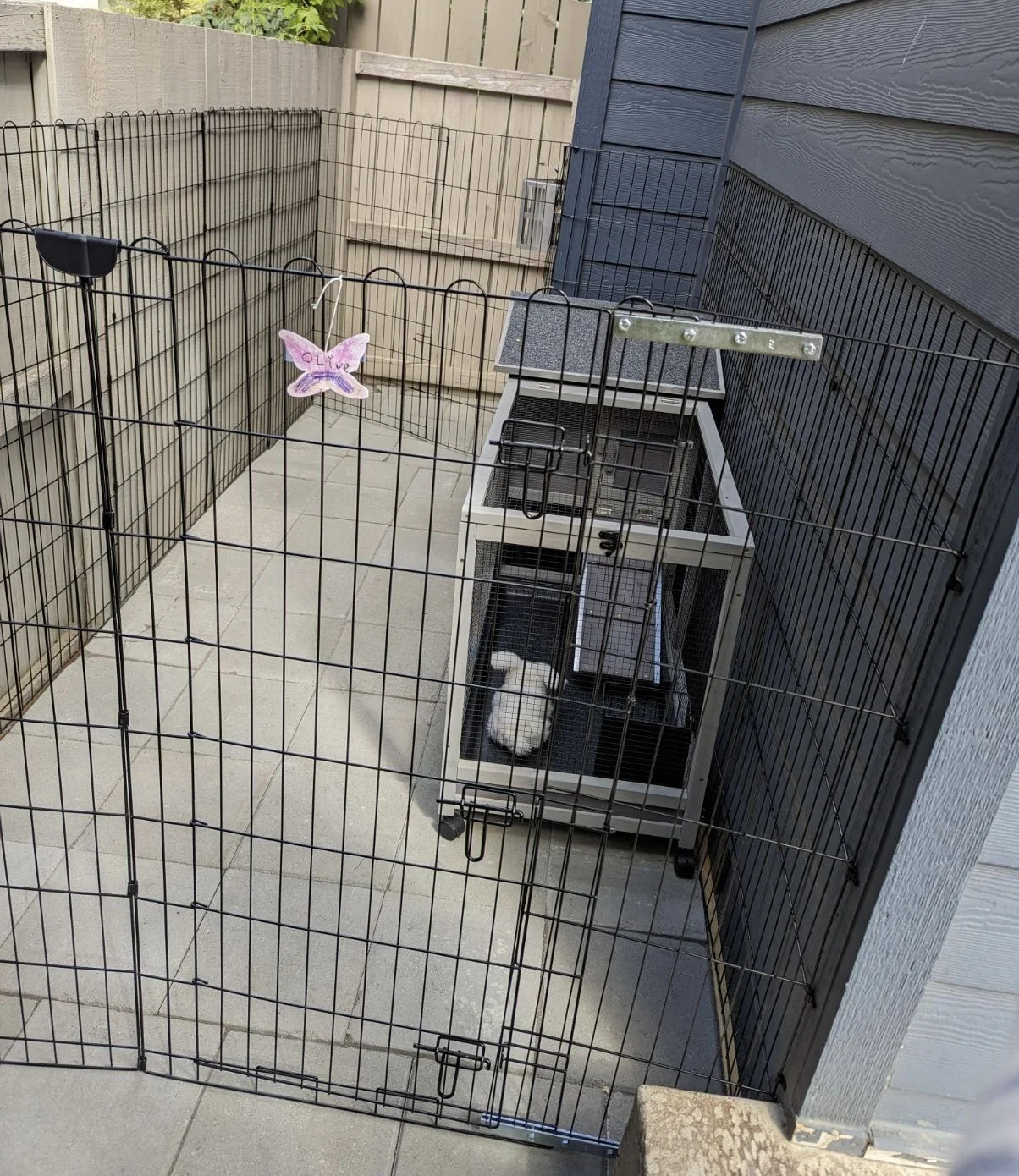 I love this sweet setup for indoors. This sweet buns Buckley has a carpet that protects the floors from accidents while also giving him a sweet space to roam.
