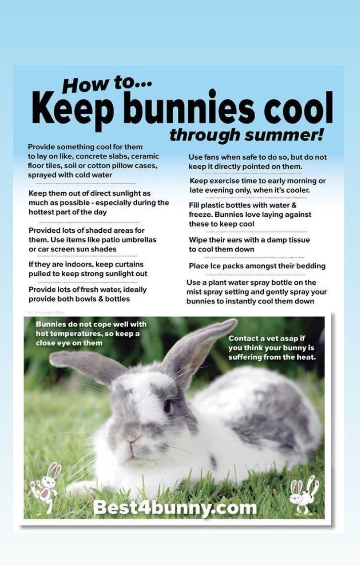 Do not bathe your bunny! Bunnies are really clean animals. They will clean themselves well. Bunnies have a hard time regulating their body temps so something as simple as getting wet can really harm your buns (or even worse, kill them).